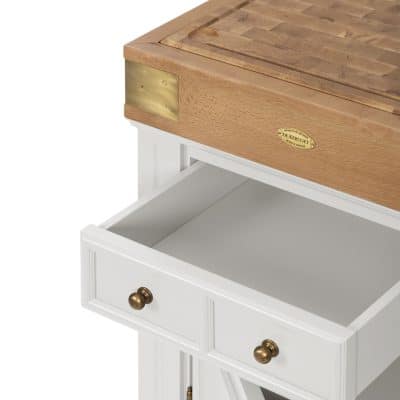 Nos plans de travail peuvent également être adaptés : bois de bout, marbre ou granit ; ou une combinaison.