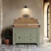 Worktop: white marble or black granite. The HOËDIC block, with its elegant “old wood” finish belt, is available in the 11 original shades that make up the DE KERCOET palette. Delivered assembled. Registered design.