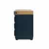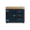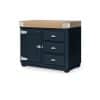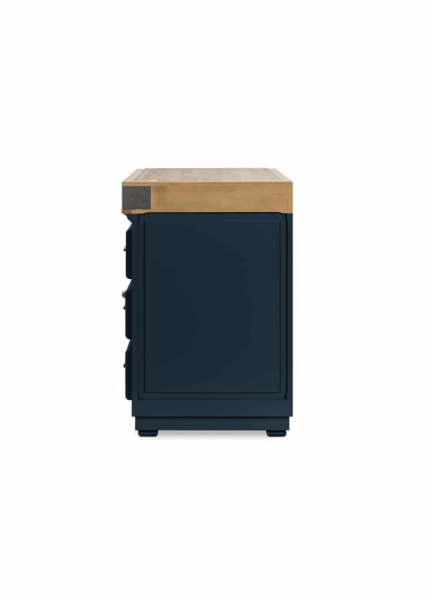 Warm wood combined with robust industrial hardware. One cupboard and three drawers on runners with integrated “soft close” shock absorbers for everyday comfort. The sides are panelled but “flat”, so you can build the unit in or not.