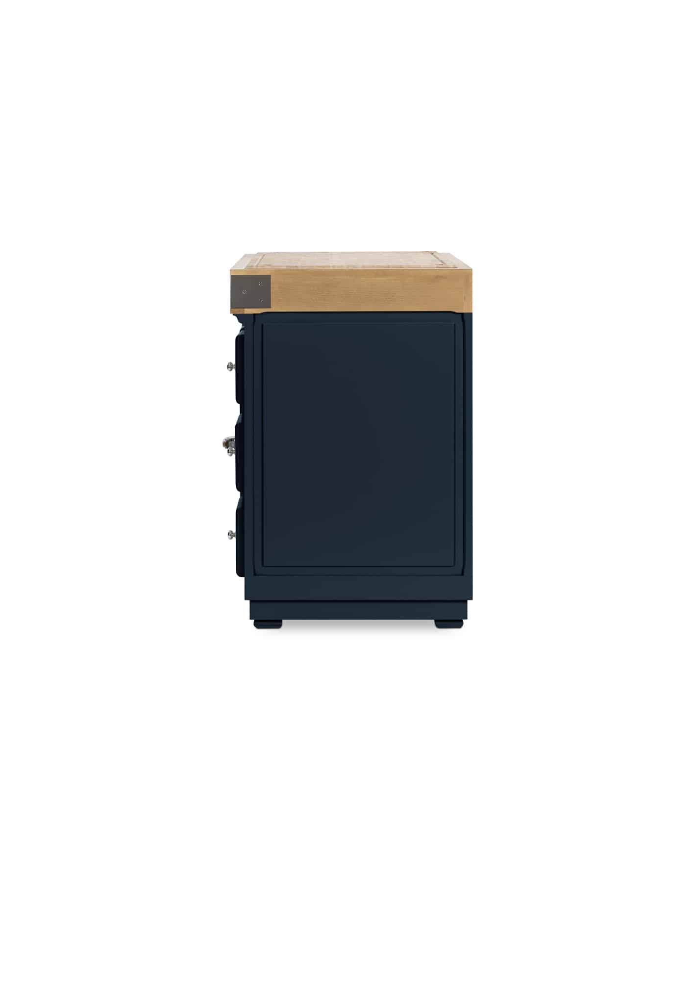 Warm wood combined with robust industrial hardware. A cupboard with middle shelf and 3 drawers on runners with integrated “soft close” shock absorbers for your everyday comfort. The sides are “flat” but panelled, so you can build the unit in or not.