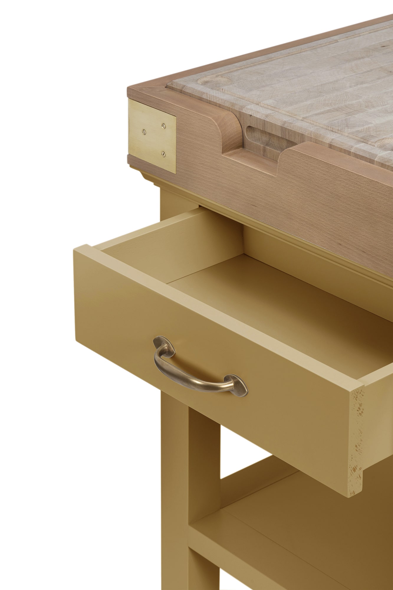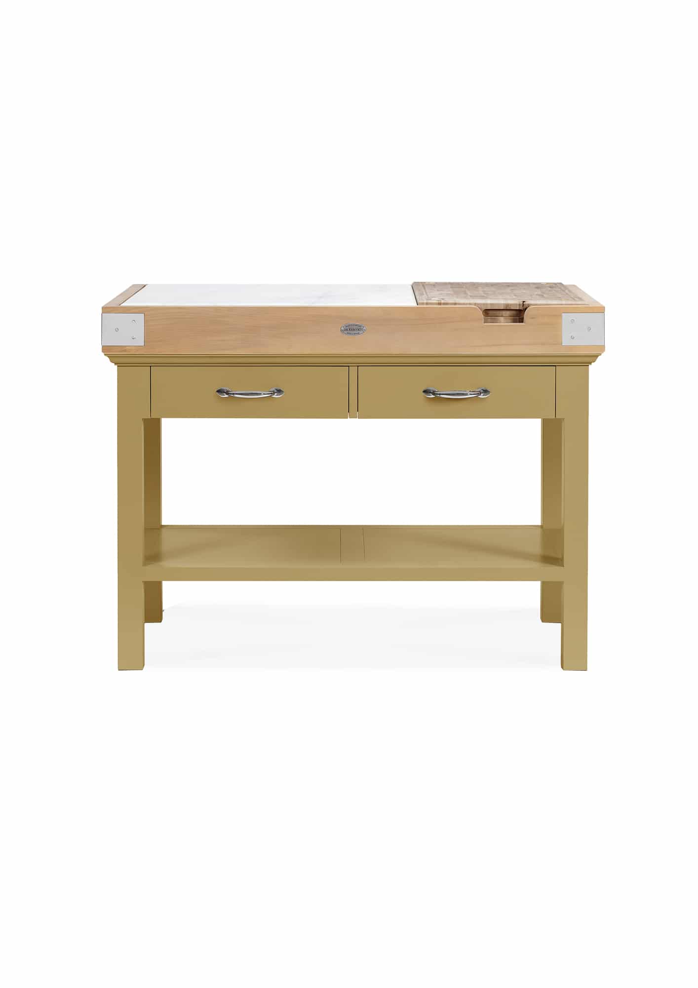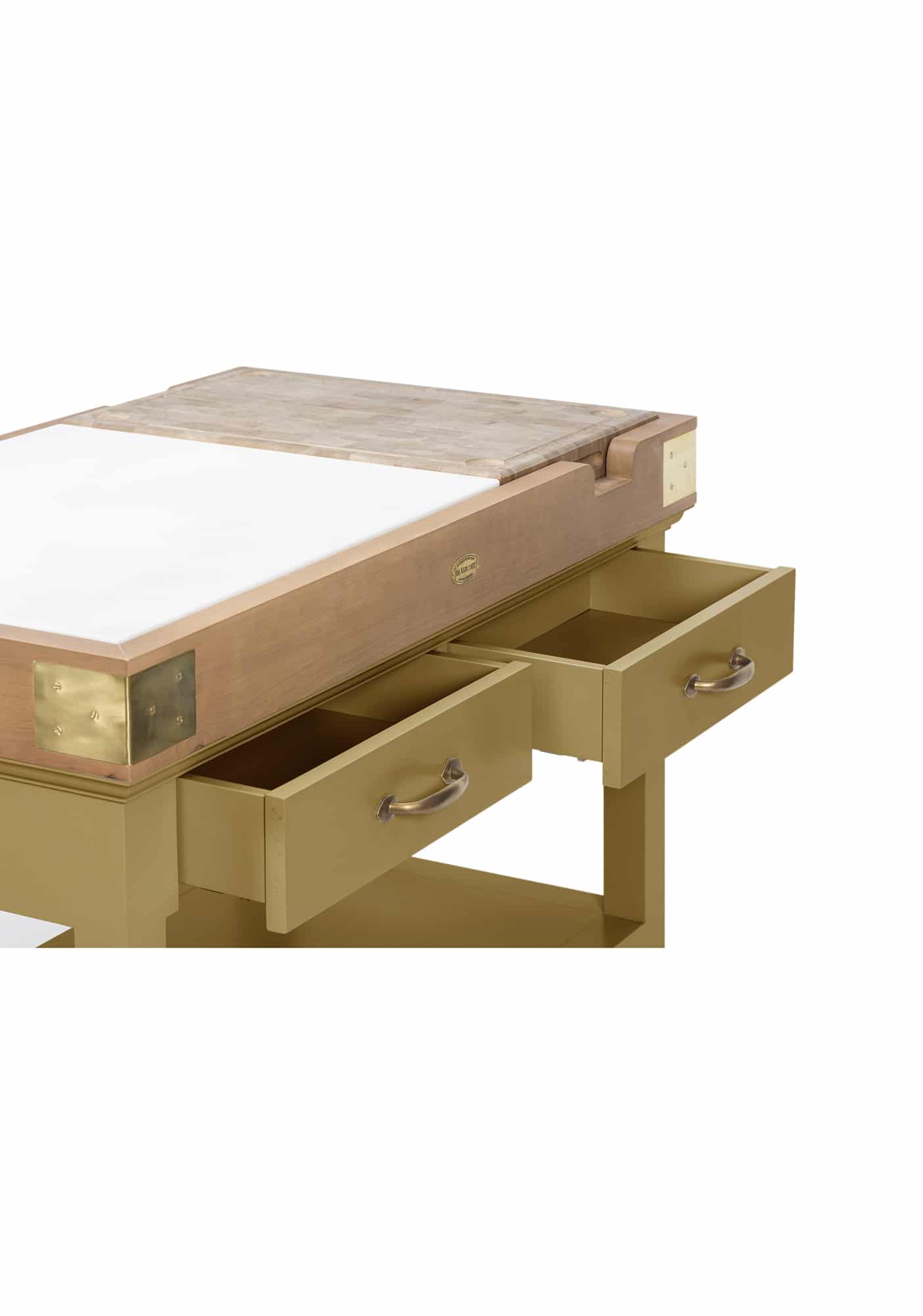 Billot îlot Cancale. La collection Cancale au charme intemporel : lignes sobres et efficaces. Son petit plus : planche de bois de bout amovible grâce à ses encoches. Îlot de cuisine identique sur l’avant et l’arrière. Quatre tiroirs montés sur glissières avec amortisseur intégré “soft close” pour votre plus grand confort au quotidien. Roulettes en option.