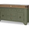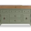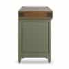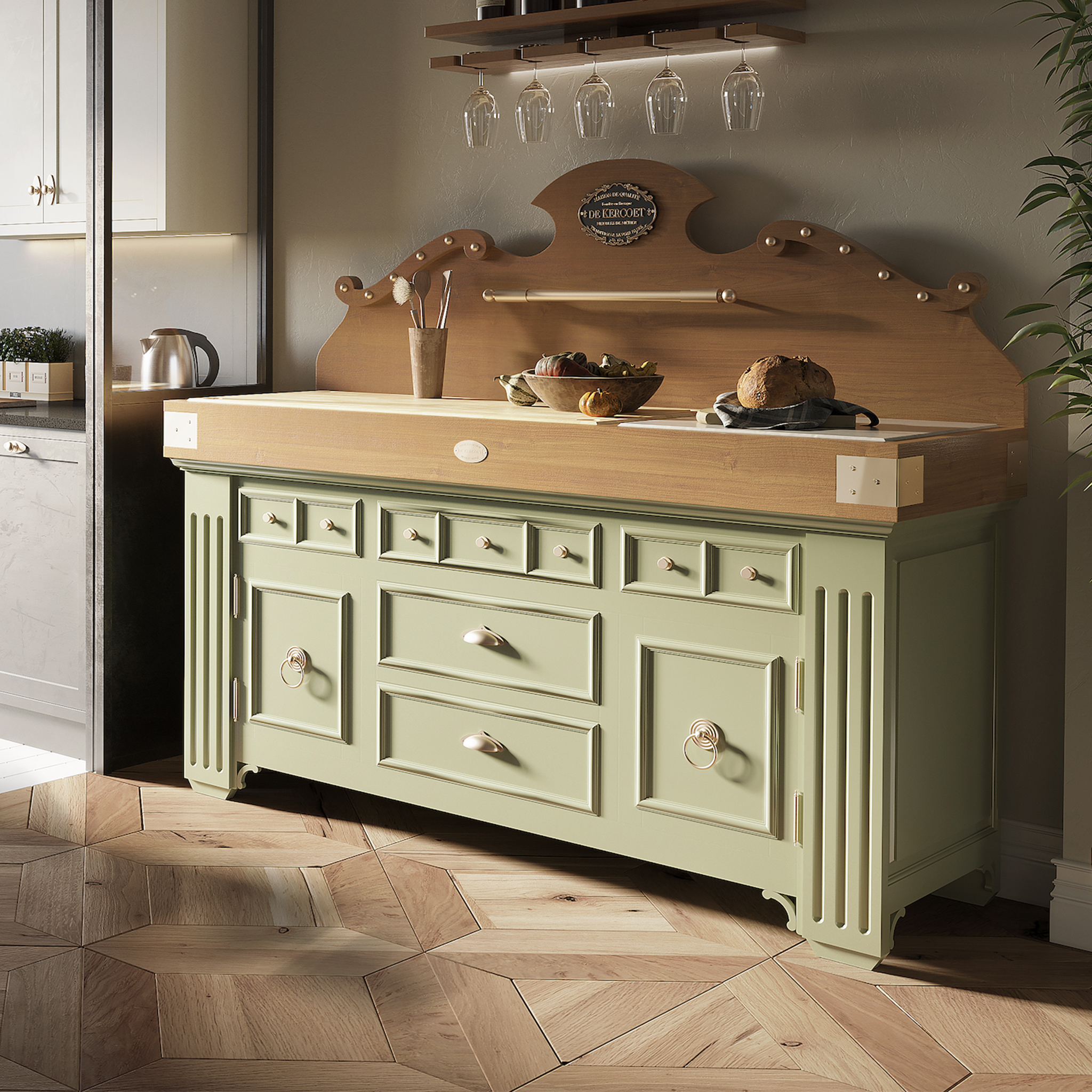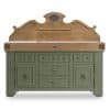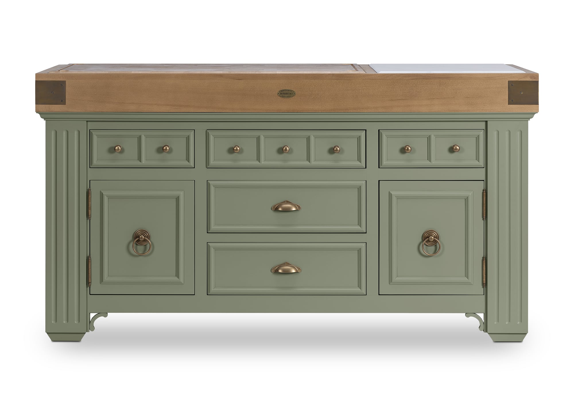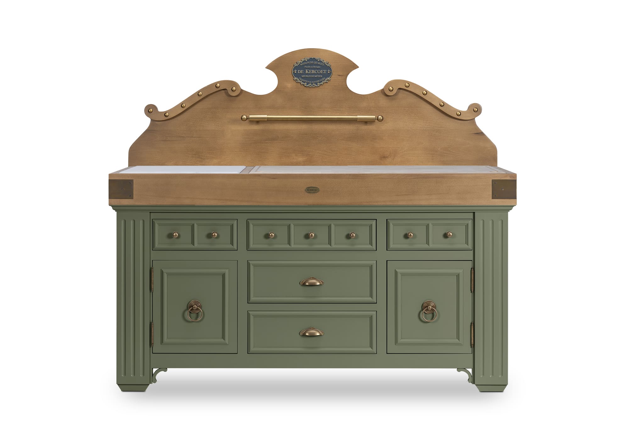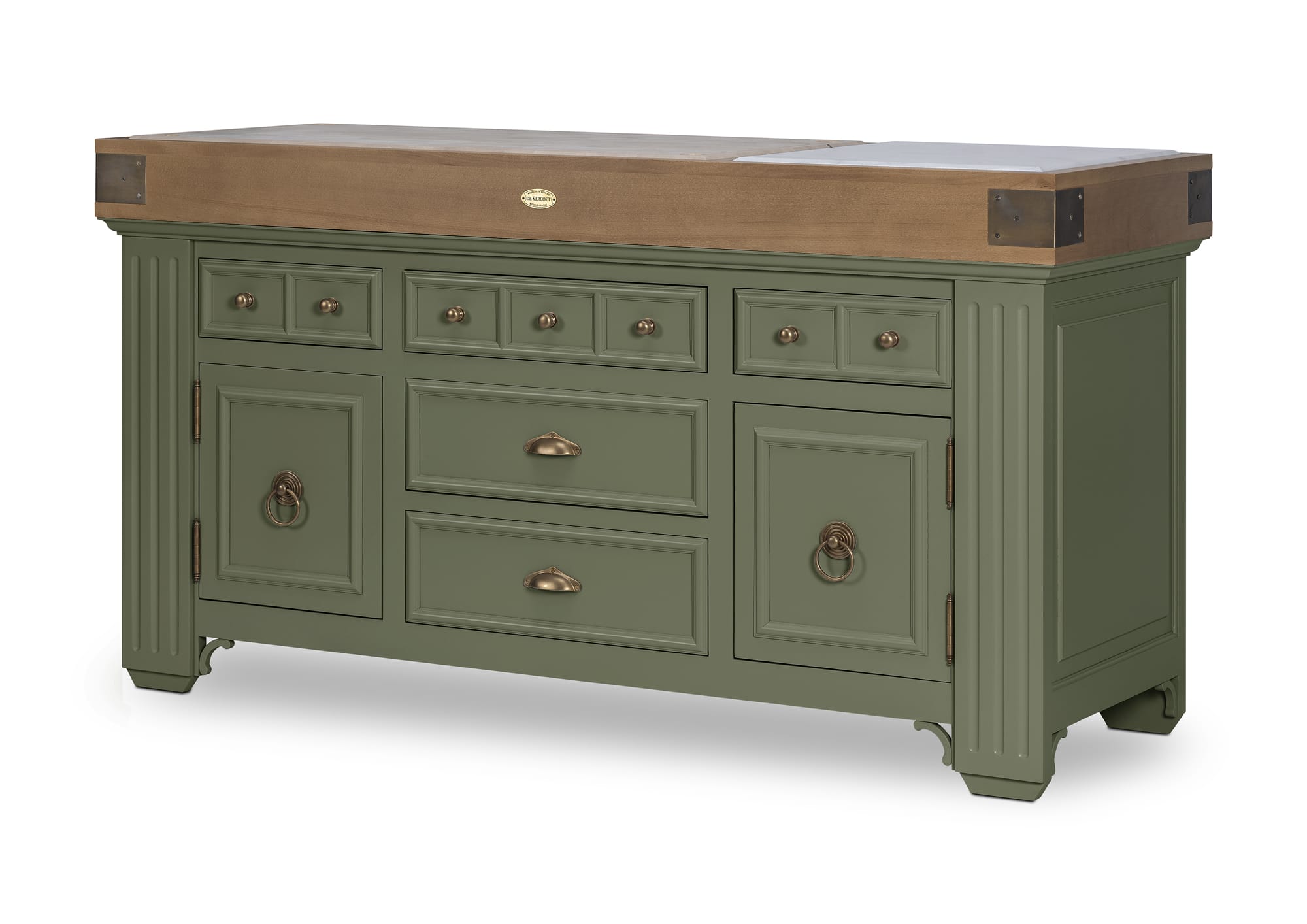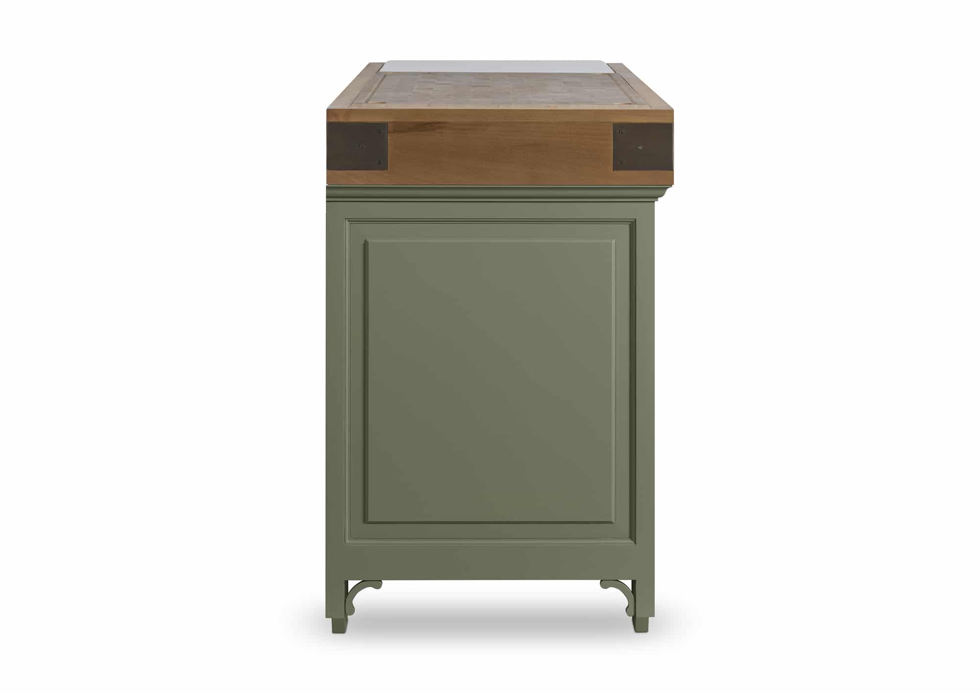 Plan de travail : bois de bout avec marbre blanc ou avec granit noir. Le billot HOËDIC avec son élégante ceinture en finition “vieux bois” se décline dans les 11 teintes originales qui composent la palette DE KERCOET. Meuble livré assemblé. Modèle déposé.