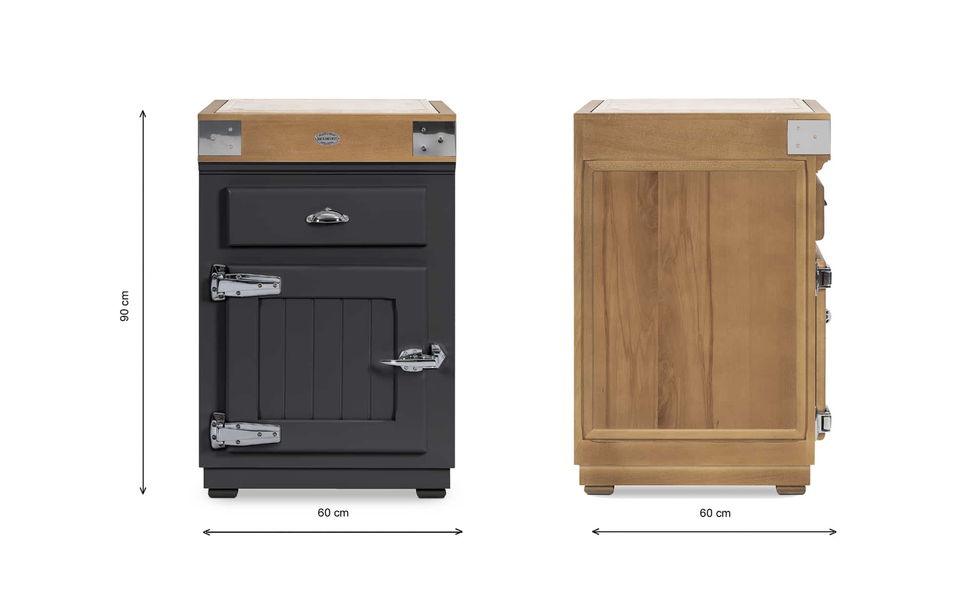 La chaleur du bois liée à la robustesse d’une quincaillerie industrielle. Le meuble s’habille d’une porte et d’un tiroir monté sur glissières avec amortisseur intégré « soft close » vous apporte un plus grand confort au quotidien. Les poignées, de qualité professionnelle, sont en finition chromée. Les côtés sont “plats” mais panneautés ; cela vous permet d’encastrer le meuble ou pas.