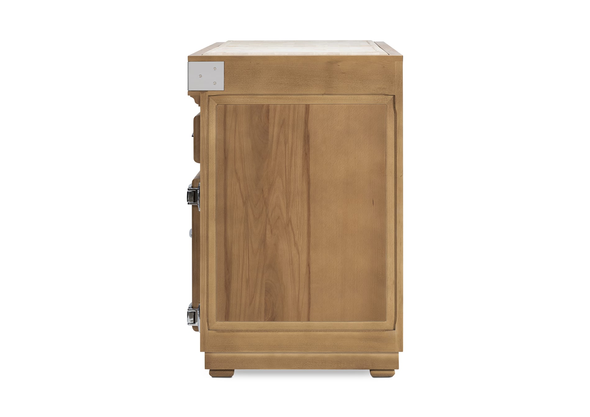 Le plan de travail est composé d’un bois de bout. Le meuble s’habille d’une porte et ses 3 tiroirs montés sur glissières avec amortisseur intégré « soft close » vous apportent un plus grand confort au quotidien. Les poignées, de qualité professionnelle, sont en finition chromée. Les côtés sont “plats” mais panneautés ; cela vous permet d’encastrer le meuble ou pas.